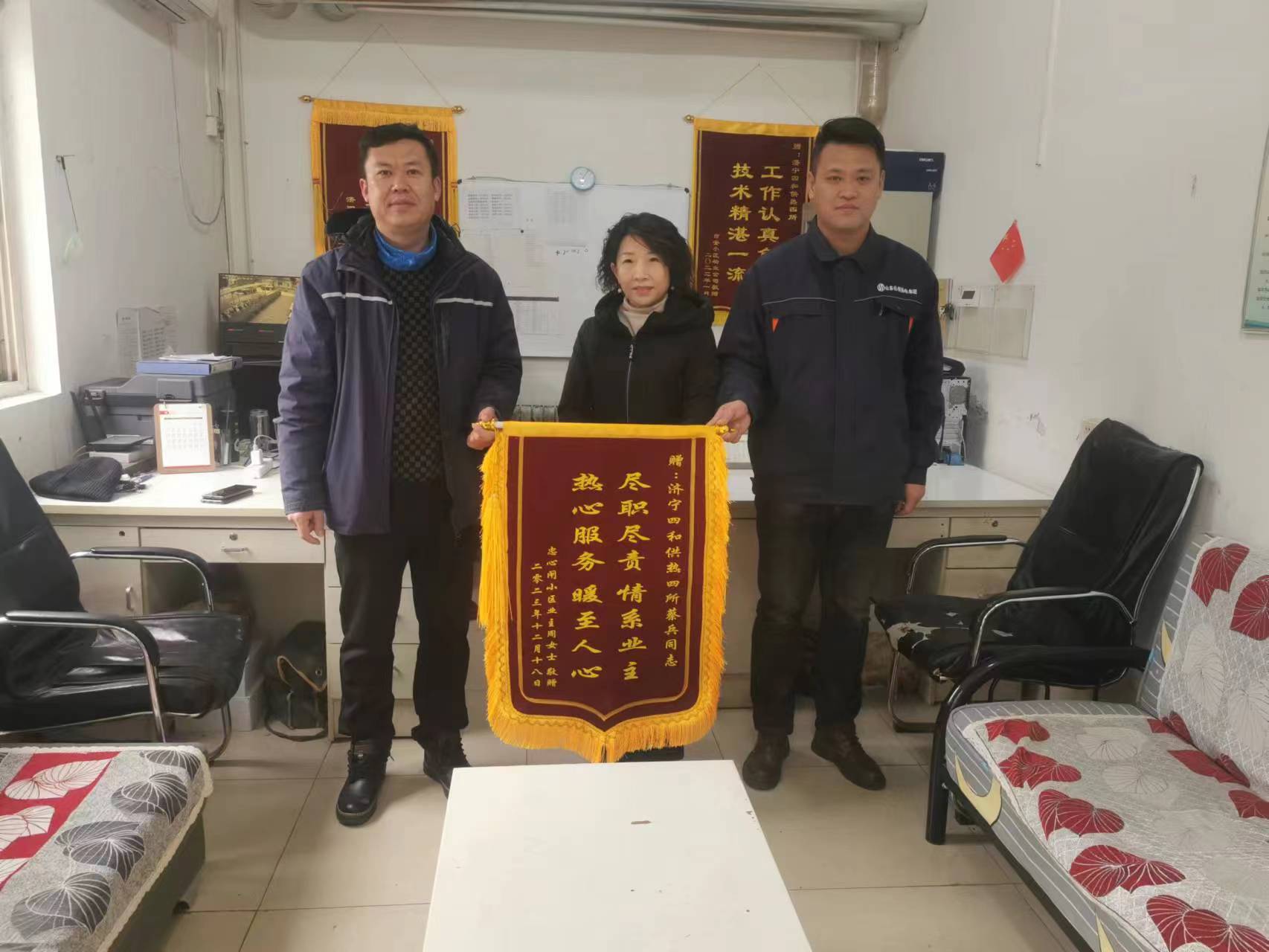12月18日,忠心閘小區(qū)業(yè)主周女士專程前往濟(jì)寧四和供熱有限公司供熱四區(qū)域,對(duì)供熱區(qū)域網(wǎng)格員熱情周到的服務(wù)表示感謝,并送去了印有“盡職盡責(zé)情系業(yè)主 熱心服務(wù)暖至人心”字樣的錦旗。