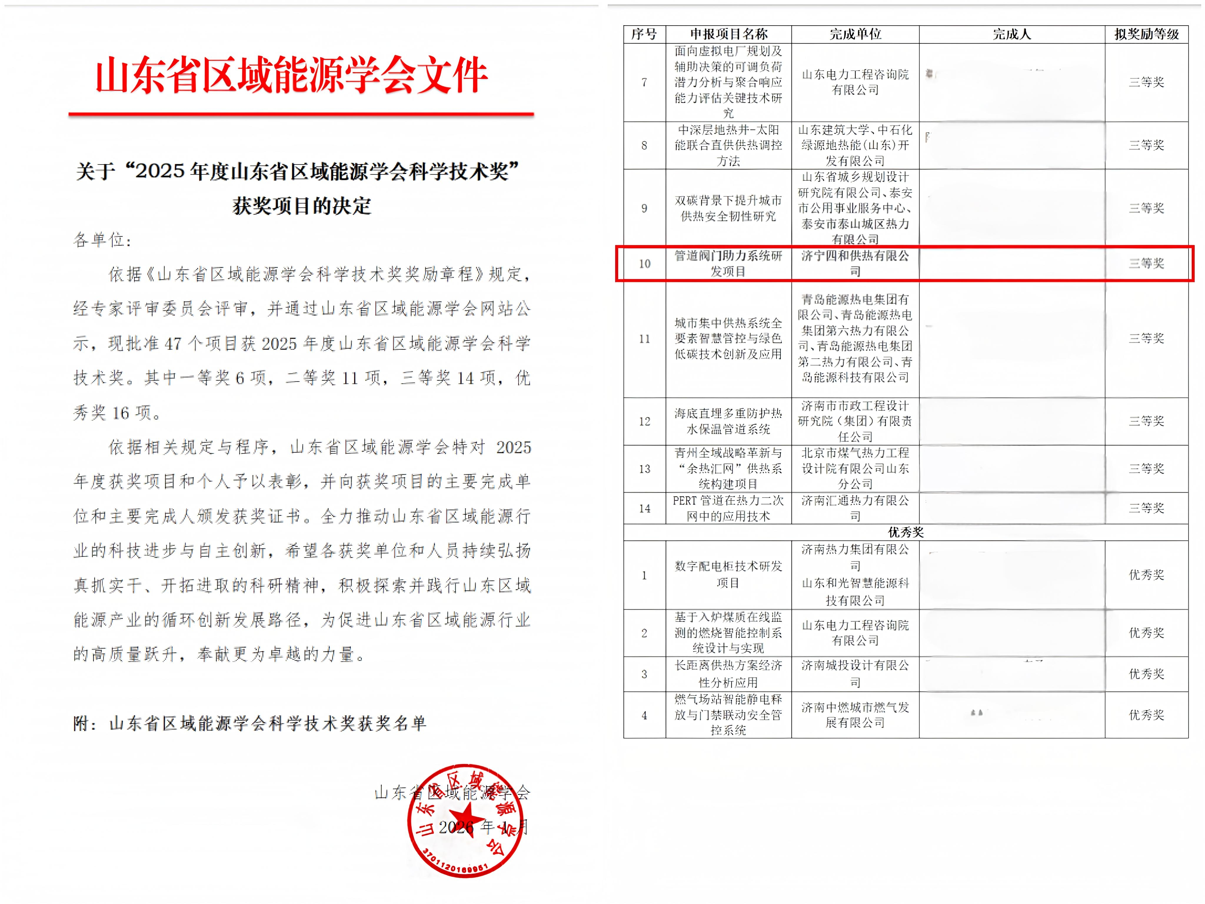 近日,2025年度山東省區(qū)域能源學(xué)會科學(xué)技術(shù)獎獲獎項目名單正式公示,濟(jì)寧四和供熱有限公司自主研發(fā)的管道閥門助力系統(tǒng)項目憑借突出的技術(shù)創(chuàng)新與應(yīng)用價值,成功獲得科學(xué)技術(shù)獎三等獎,這是對四和供熱公司技術(shù)研發(fā)實力和成果轉(zhuǎn)化能力的高度認(rèn)可。